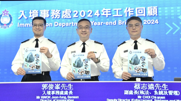 ▲左起:入境處副處長程和木(管制、簽證及證件)、入境處處長郭俊峯、入境處副處長蔡志遠(執法、系統及管理)。
