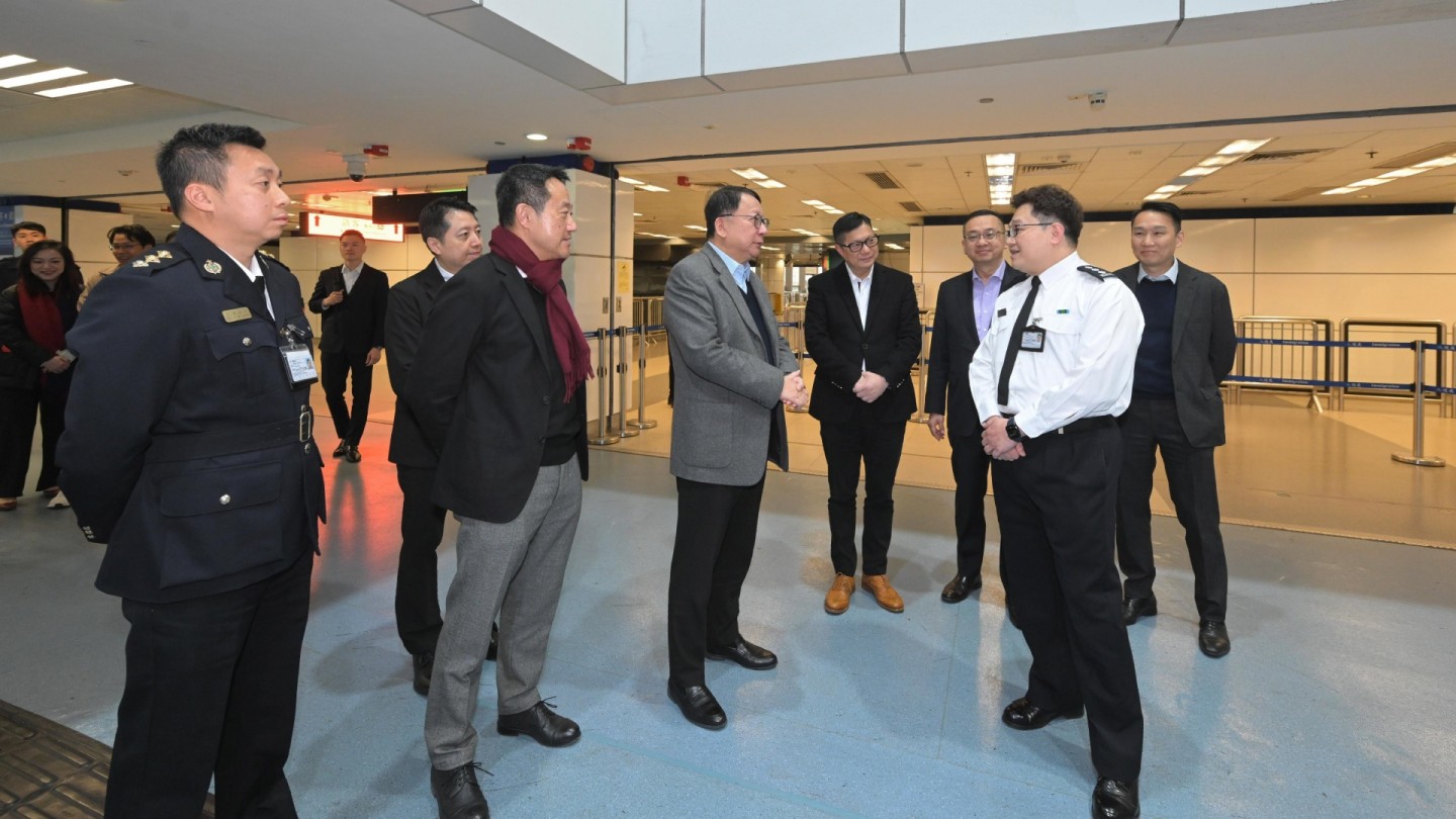 【年初一/農歷新年】香港特區政府政務司司長陳國基今日(29日)在保安局局長鄧炳強、入境事務處處長郭俊峯和海關關長陳子達陪同下,視察羅湖管制站,了解口岸部門應對農歷新年期間出入境人流上升的各項安排和運作,沿途又向市民和旅客拜年。他指示各部門聯同不同持份者加強信息發布,包括各邊境管制站情況、交通安排等,方便市民和旅客規劃行程。
