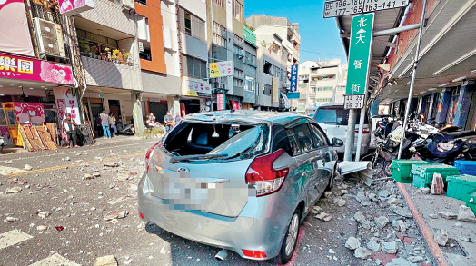 ▲地震過后,臺南一幢樓宇外牆剝落,砸中兩架私家車。