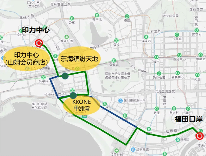 而B線則為福田口岸循環線,途經卓悅中心、領展中心城(皇庭廣場)、COCO Park、平安金融中心、卓越INTOWN等,服務時間為上午10時至晚上9時,同樣是每30分鐘一班車,非常適合假日北上吃喝玩樂的港人。