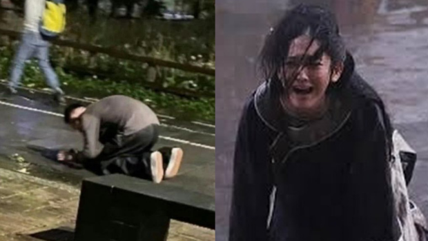 ▲汪小菲雨中跪地畫面曝光,網酸作秀。(圖/翻攝自微博)