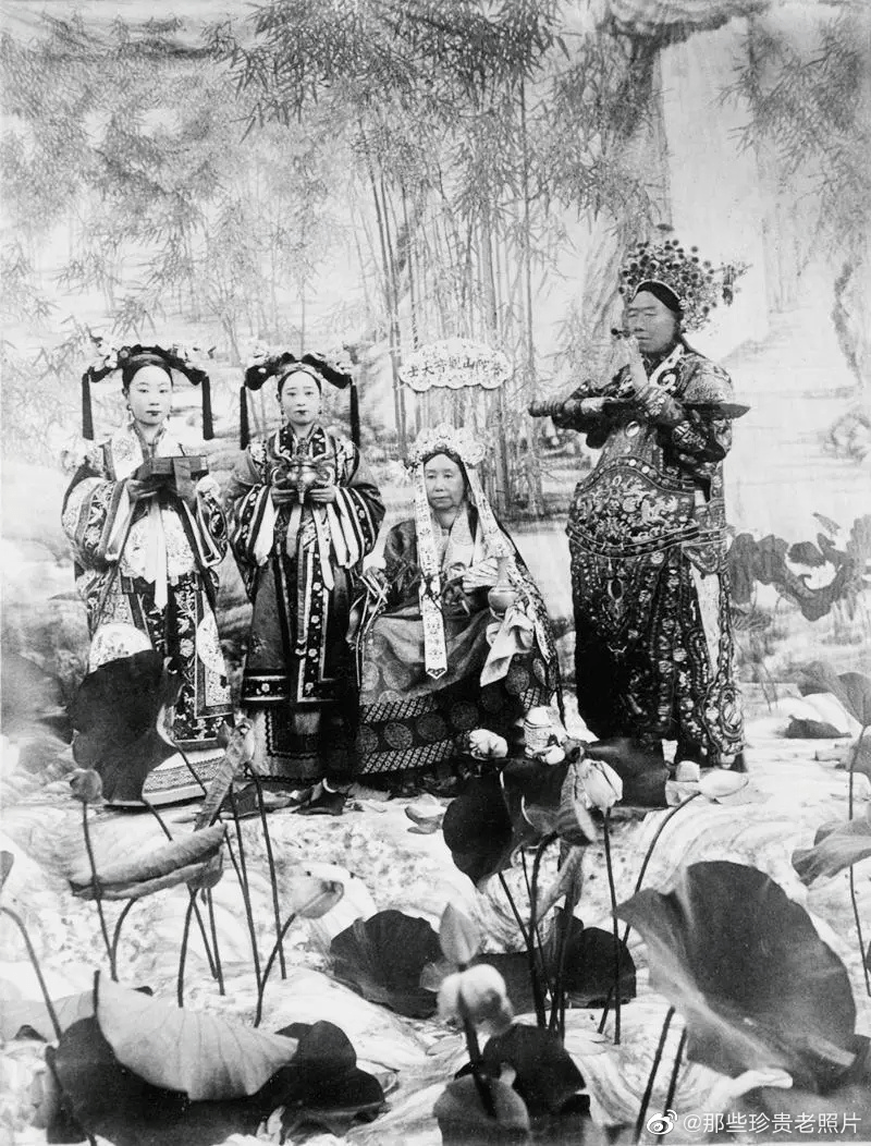 ▲慈禧愛扮觀音拍照,左一為“三格格”、左二為“五格格”,右為李蓮英。
