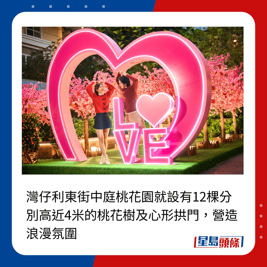 ▲灣仔利東街中庭桃花園就設有12棵分別高近4米的桃花樹及心形拱門,營造浪漫氛圍。