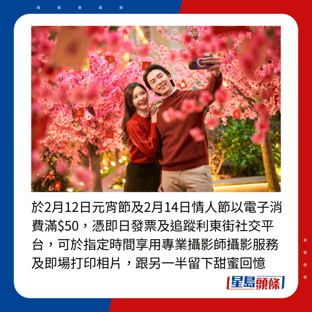 ▲于2月12日元宵節及2月14日情人節以電子消費滿$50,憑即日發票及追蹤利東街社交平臺,可于指定時間享用專業攝影師攝影服務及即場打印相片,跟另一半留下甜蜜回憶。