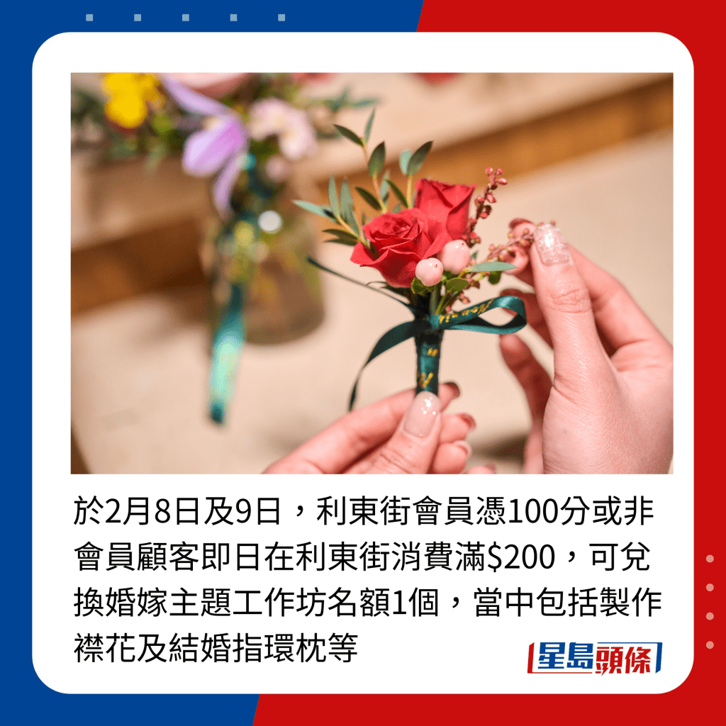 ▲于2月8日及9日,利東街會員憑100分或非會員顧客即日在利東街消費滿$200,可兌換婚嫁主題工作坊名額1個,當中包括制作襟花及結婚指環枕等。