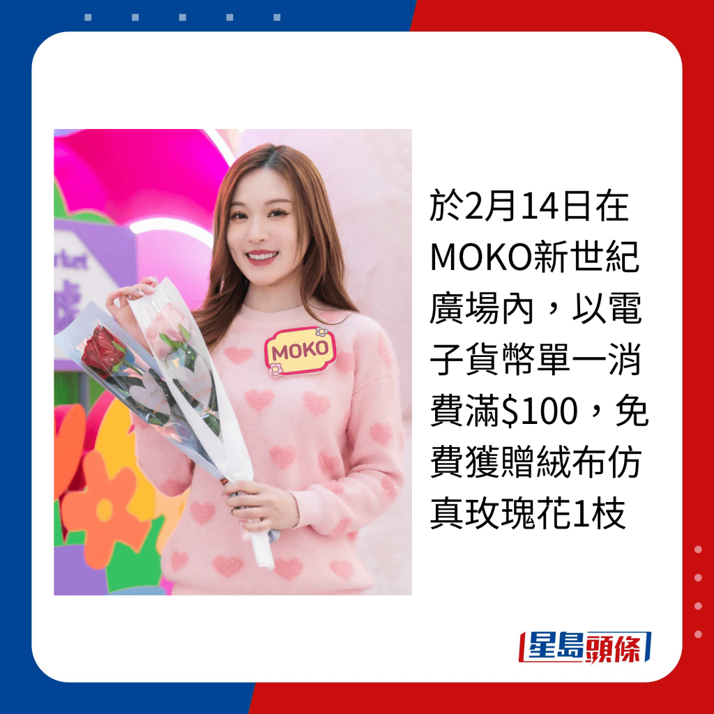 ▲于2月14日在MOKO新世紀廣場內,以電子貨幣單一消費滿$100,免費獲贈絨布仿真玫瑰花1枝。
