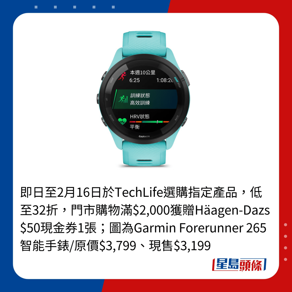 ▲即日至2月16日于TechLife選購指定產品,低至32折,門店購物滿$2,000獲贈H?agen-Dazs $50現金券1張; 圖為Garmin Forerunner 265智能手表/原價$3,799、現售$3,199。