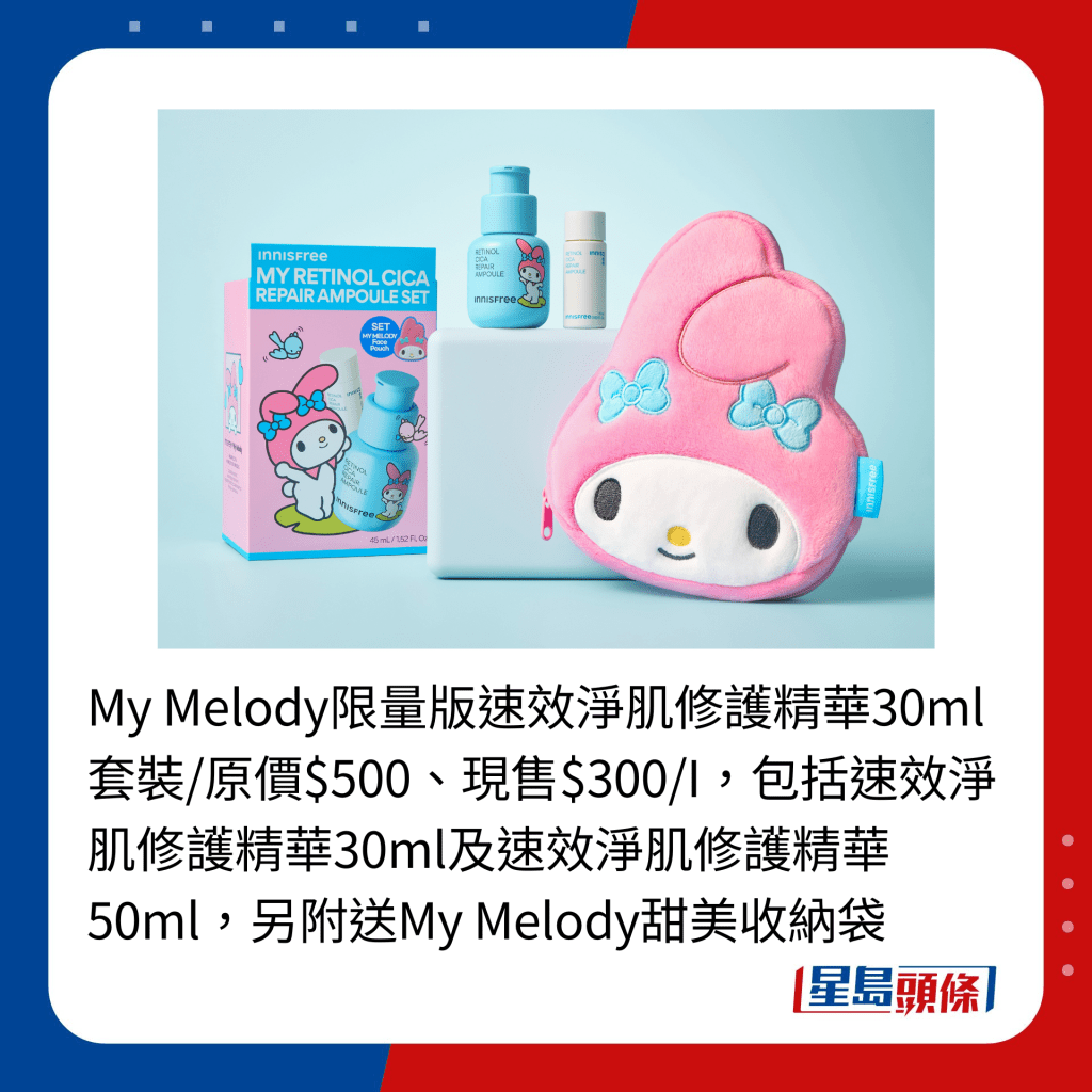 ▲My Melody限量版速效凈肌修護精華30ml套裝/原價$500、現售$300/I,包括速效凈肌修護精華30ml及速效凈肌修護精華50ml,另附送My Melody甜美收納袋。