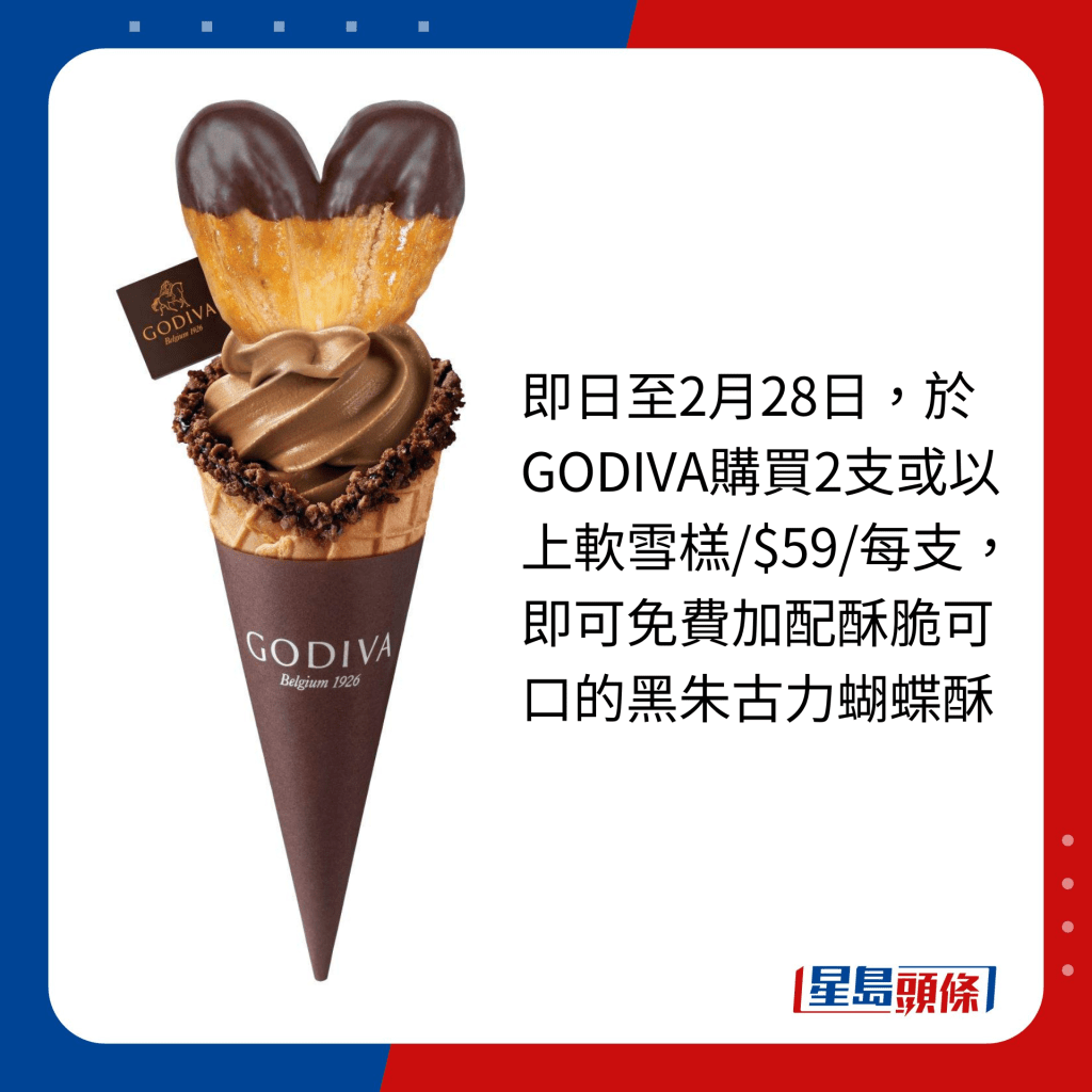 ▲即日至2月28日,于GODIVA購買2支或以上軟雪榚/$59/每支,即可免費加配酥脆可口的黑朱古力蝴蝶酥。