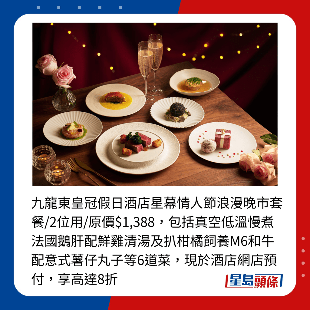 ▲九龍東皇冠假日酒店星幕情人節浪漫晚市套餐/2位用/原價$1,388,包括真空低溫慢煮法國鵝肝配鮮雞清湯及扒柑橘飼養M6和牛配意式薯仔丸子等6道菜,現于酒店網店預付,享高達8折。