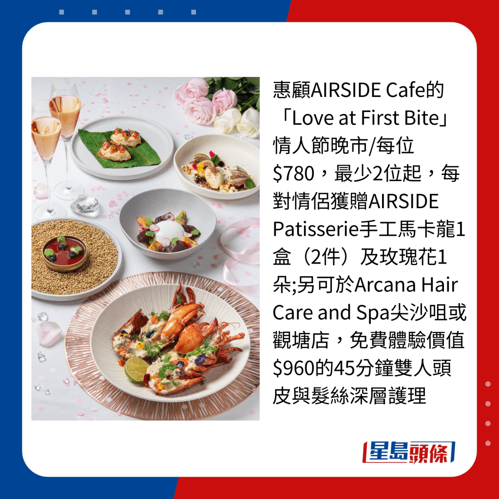 ▲惠顧AIRSIDE Cafe的“Love at First Bite”情人節晚市/每位$780,最少2位起,每對情侶獲贈AIRSIDE Patisserie手工馬卡龍1盒(2件)及玫瑰花1朵; 另可于Arcana Hair Care and Spa尖沙咀或觀塘店,免費體驗價值$960的45分鐘雙人頭皮與發絲深層護理。