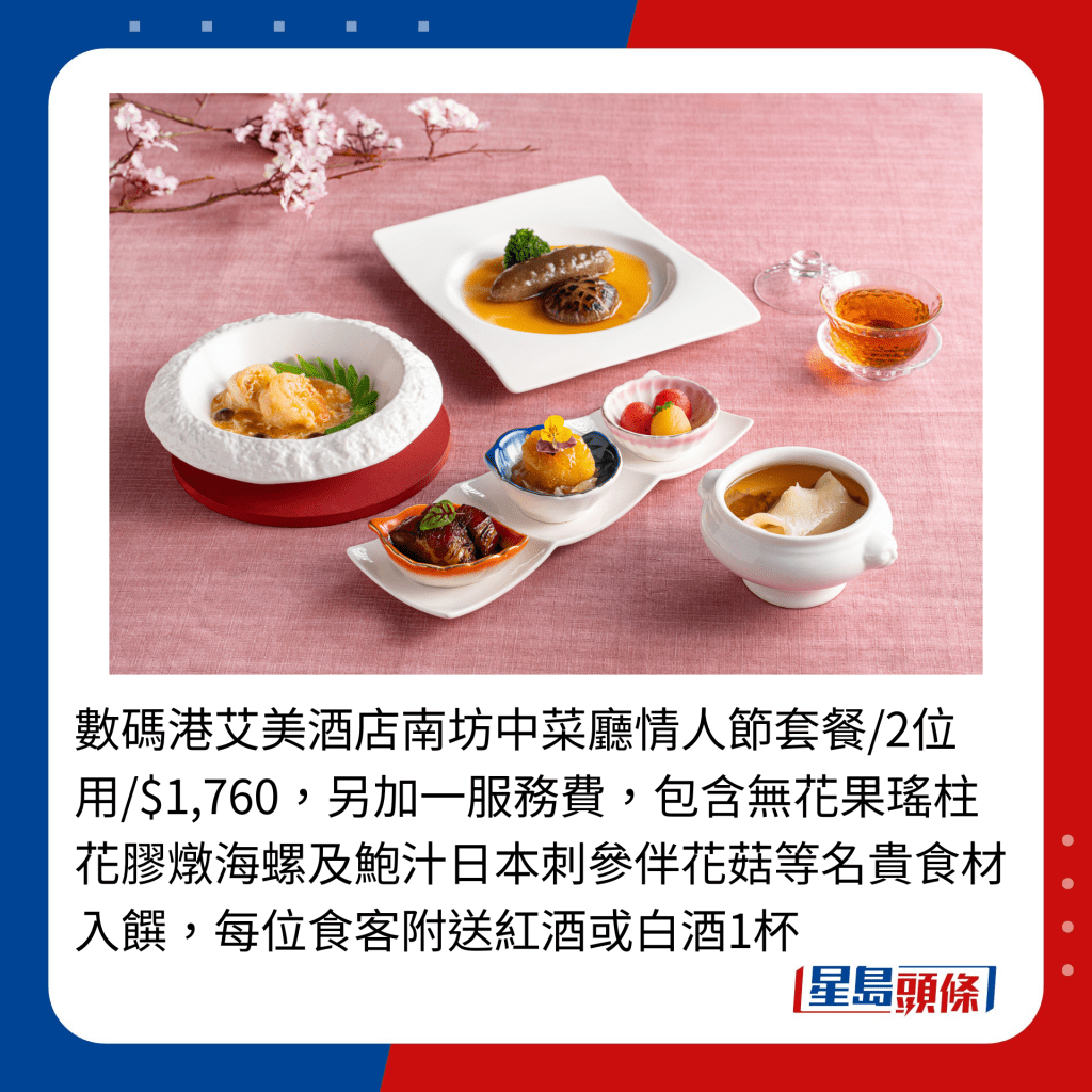 ▲數碼港艾美酒店南坊中菜廳情人節套餐/2位用/$1,760,另加一服務費,包含無花果瑤柱花膠燉海螺及鮑汁日本刺參伴花菇等名貴食材入饌,每位食客附送紅酒或白酒1杯。