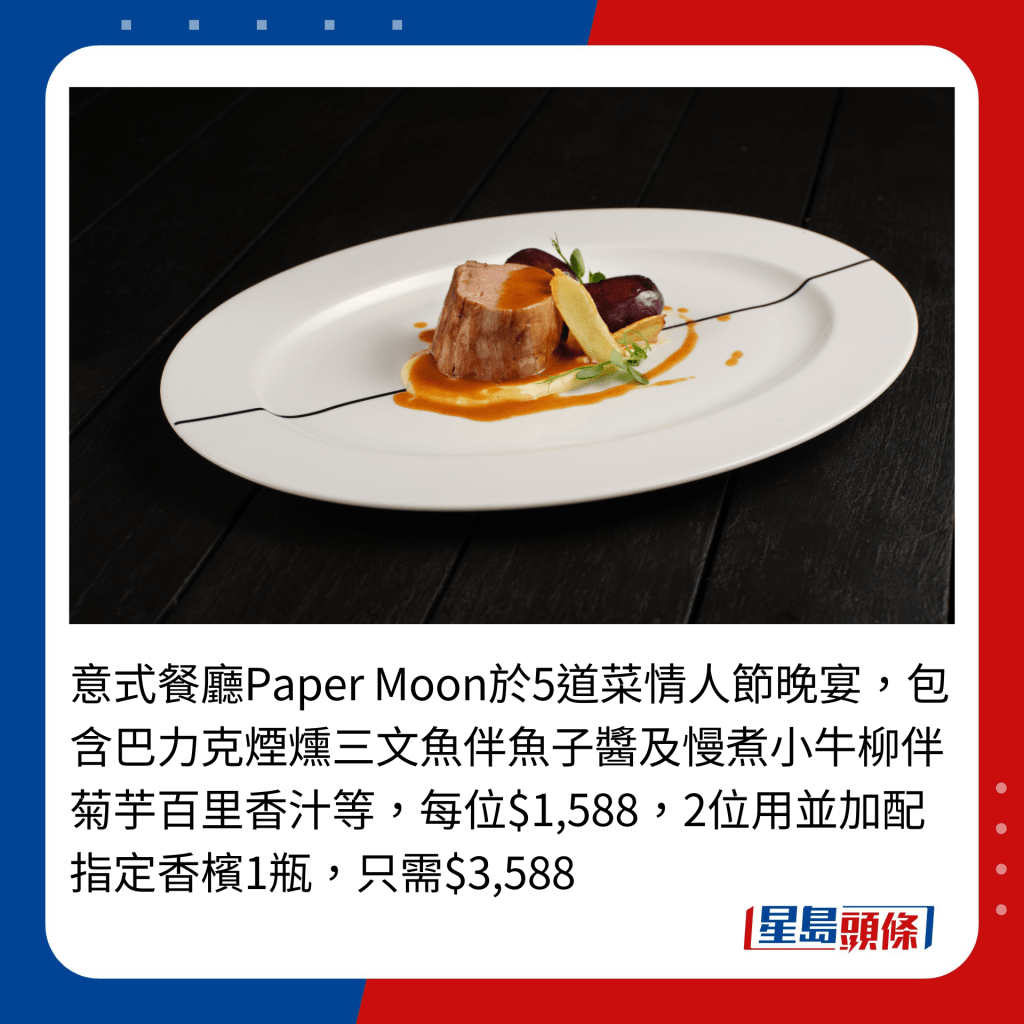 ▲意式餐廳Paper Moon于5道菜情人節晚宴,包含巴力克煙熗三文魚伴魚子醬及慢煮小牛柳伴菊芋百里香汁等,每位$1,588,2位用并加配指定香檳1瓶,只需$3,588。
