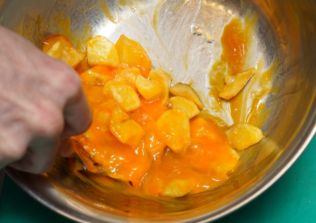 4. 加炸過的薯仔,用叉將薯仔壓成小粒后拌勻。