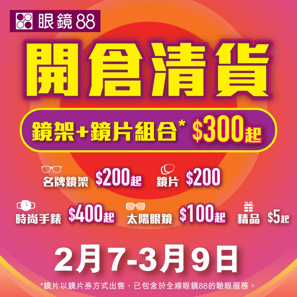 眼鏡88開倉清貨優惠!由即日起至3月9日,眼鏡88 Optical 88 Hong Kong 會在新蒲崗舉辦快閃開倉消貨優惠活動?,F場有大量人氣名牌鏡架、太陽眼鏡及時尚腕表等,低至$100,鏡架+鏡片組合更只需$300起,非常抵買!入場前預先領取電子換領券,于任何消費后更可換領精美禮物一份,想配眼鏡的朋友不容錯過,隨時比返深圳配更平!