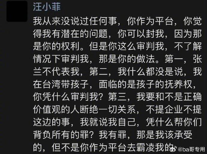 其后汪小菲在朋友圈直指,自己從來沒說過任何事,抖音作為平臺,覺得有潛在的問題,可以封他,因為那是平臺的權利?!暗悄氵@么審判我,不了解情況下審判我,那是你的做法?!苯又蔡岢?點,“第一,張蘭不代表我。第二,我什么都沒說,我在臺灣帶孩子,面臨的是孩子的撫養權,你憑什么審判我?第三,我要和不是正確價值觀的人斷絕一切關系,不提企業、不提這邊的事,我就說我自己,憑什么幫你們背負所有的罪?我有罪,那是我該承受的,但不是你作為平臺去霸凌我的”。網上更瘋傳汪小菲高喊“我不孝,但是絕對不能讓這種人獲得支持?!彼€稱吐露“她是我媽,可是我和她的三觀天地不合,我不是東西,我對不起所有人”接著就宣告“從今天起,我要和她斷絕所有關系”,更認為張蘭賺得錢已夠活幾輩子。