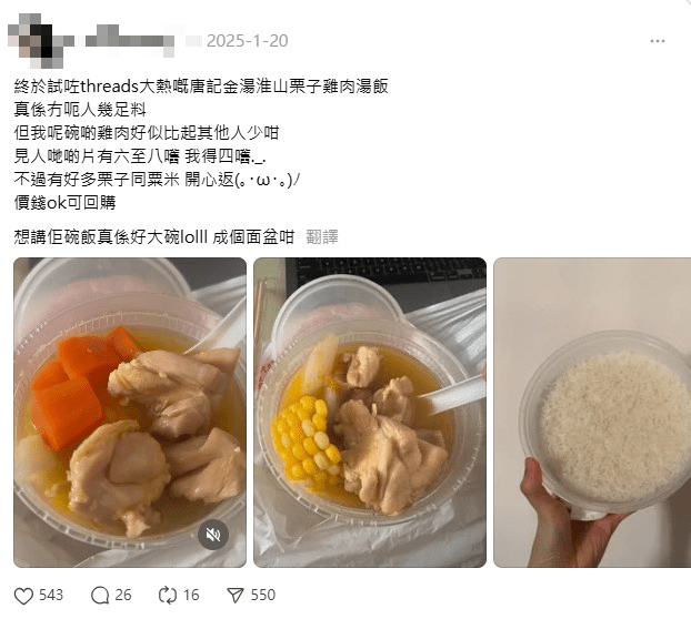 ▲有多名網民在社交平臺Threads上發帖,盛贊金湯淮山栗子雞肉湯飯
