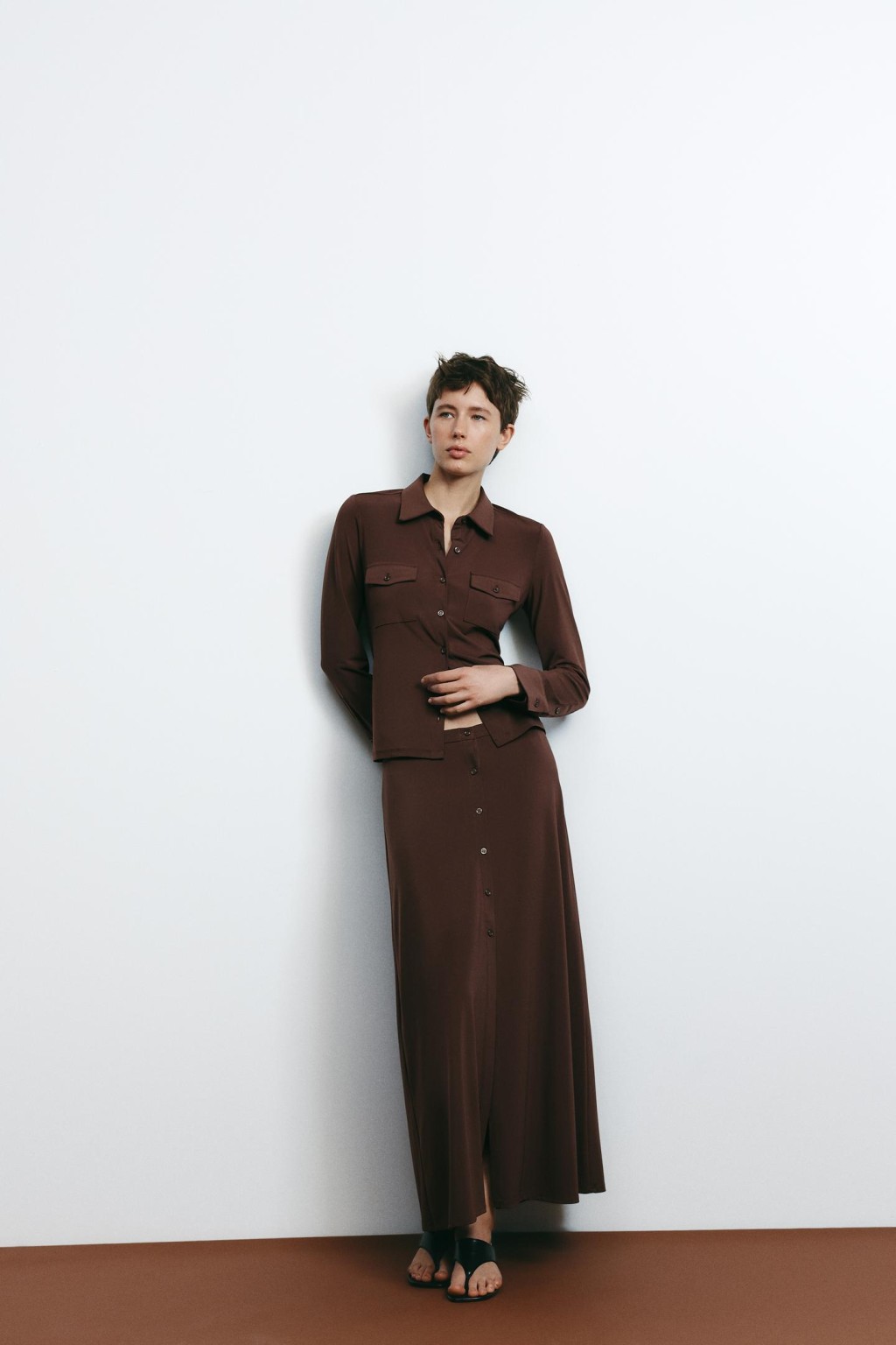 ▲ZARA附口袋恤衫 $329、綴鈕扣半截長裙$399。
