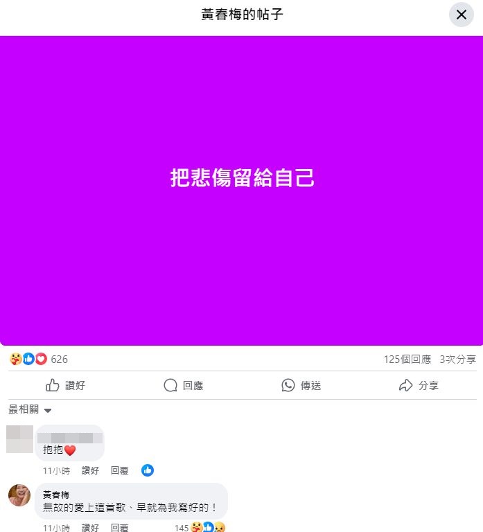 ▲S媽(黃春梅)昨日(10日)深夜11時許突然在社交網發文“把悲傷留給自己”,在留言區寫下“無故的愛上這首歌、早就為我寫好的!”