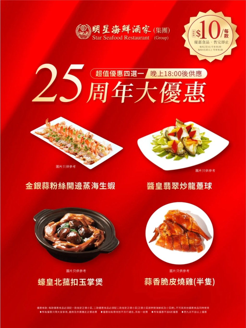 明星海鮮酒家以新鮮食材和精致烹調而聞名。為慶祝品牌創立25周年,酒樓更特別推出超值晚市優惠,每晚6點后,粉絲蒸蝦、炒龍躉球、脆皮燒雞等四款精選小菜僅需$10,讓顧客以超優惠價格享受高質量美食!