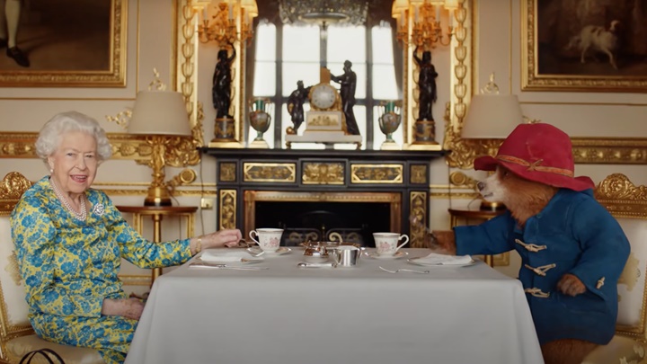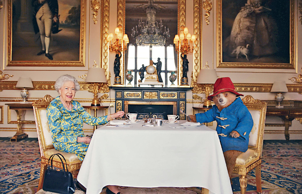 ▲英女皇和柏靈頓熊在短片中,平起平坐嘆茶。