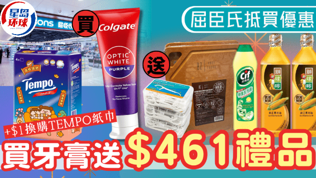 屈臣氏 Watsons一向以提供多樣化的產品及優惠而深受消費者喜愛。 近日,屈臣氏就推出了一項超值優惠,購買高露潔牙膏即可獲贈價值高達$461的家居好禮,還有易賞錢會員更可額外以$1換購Tempo紙巾!