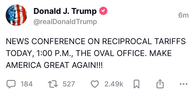 特朗普稍早前在旗下社交平臺Truth Social以全部大寫字母發文預告:“偉大的過去3星期,或許是有史以來最棒的,不過今天才是重頭戲:對等關稅?。?!讓美國再次偉大?。?!”