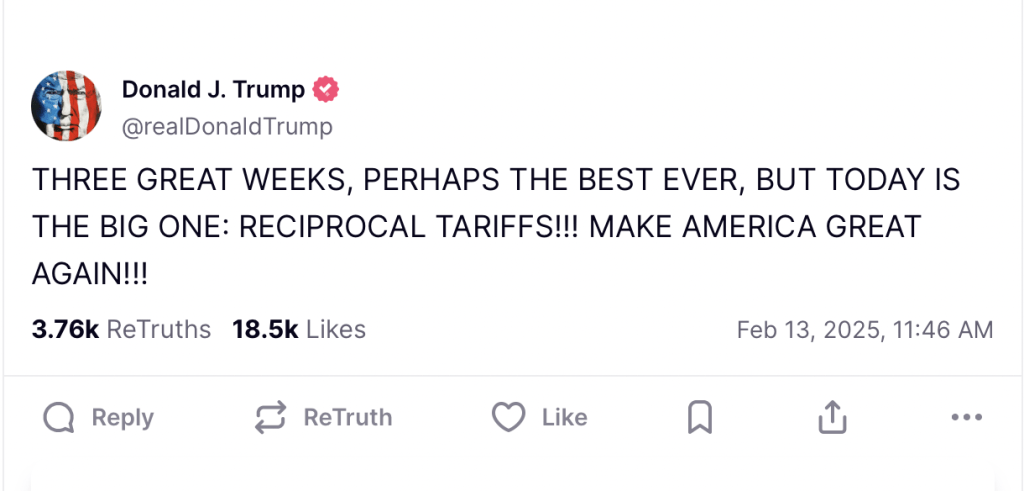 ▲特朗普在旗下社交平臺真相社交以全部大寫字母發文說:“偉大的過去3星期,或許是有史以來最棒的,不過今天才是重頭戲:對等關稅!!讓美國再次偉大!!”