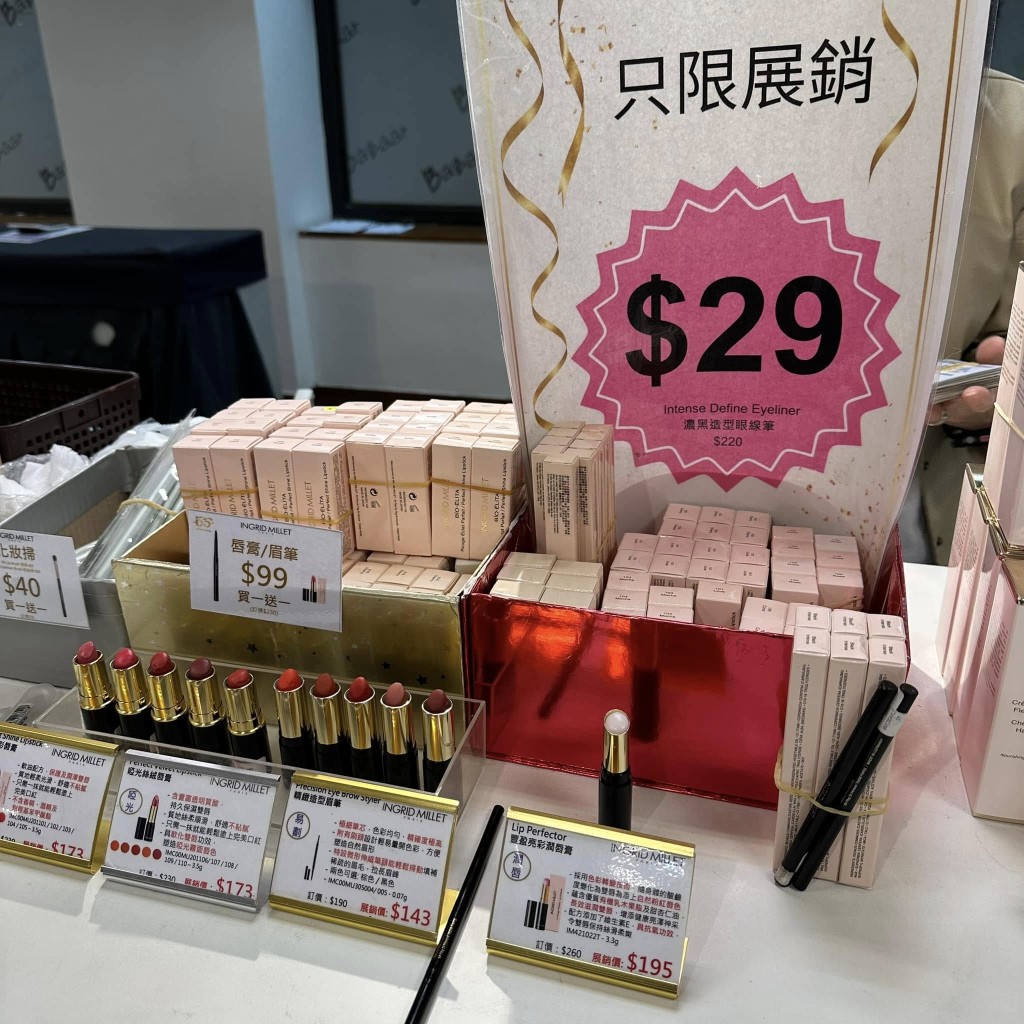 法國殿堂級美容品牌INGRID MILLET于今次開倉推出超抵買一送一優惠,換言之以半價發售,包括白松露保濕精華液、保濕水、膠原再生眼膜、面霜等,原價$220眼線筆亦激減至$29,足足有14折!此外,品牌的美容療程以特惠價錢發售,方便不同客人需要。除了美妝用品外,Champion上衣、本地APG玩味設計TEE、PALLADIUM等鞋款及服飾低至$50,最近下雨天以$299入手防水靴子亦相當實惠,現場指定品牌買滿3件額外再享8折優惠!