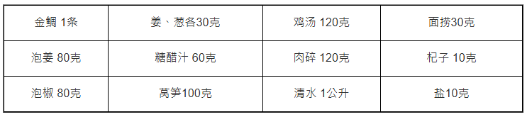 1.鯛魚起肉切件,放入混合鹽、姜及蔥的水中浸45分鐘。