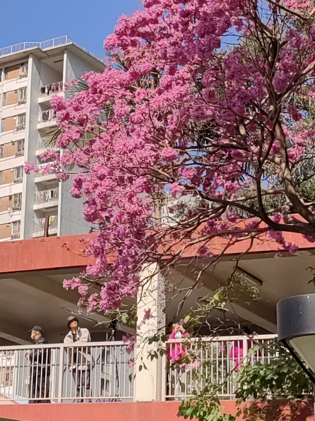春天來臨,又到紅花風鈴木盛放的季節,最近香港粉嶺中心外的行人天橋出現限時美景,附近種植的紅花風鈴木進入全盛時期,正燦爛盛放,將整個樹冠染成紫粉紅花海,滿樹繽紛,吸引不少攝影發燒友前往捕捉美景,不少網民大贊夢幻:“景色不輸日本!”香港康文署近日亦更新開花情報,指現時達至滿開狀態,想一睹美景的大家要把握時機!