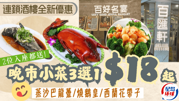 這間百匯軒屬百好飲食集團,而百好旗下的百好名宴、壹匯中菜廳、百匯軒、百匯酒家、都匯漁港、彩匯皇宮、百匯小品及金百滬,近日推出“晚飯優品3選1”優惠,顧客凡于下午5時30后惠顧晚市堂食,可于3款特價小菜中選一款,包括有清蒸沙巴龍躉、至尊燒鵝皇、西蘭花蝦球炒帶子,每款低至$18起,非常抵食!