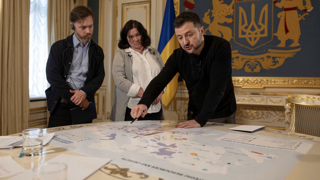 ▲澤連斯基在總統辦公室受訪,公開烏克蘭的稀土礦藏地圖。 路透社
