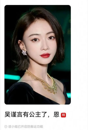 ▲近日有網民在社交網上流傳一張截圖,寫著:“吳謹言有公主了?!卑抵杆旬a下一女。