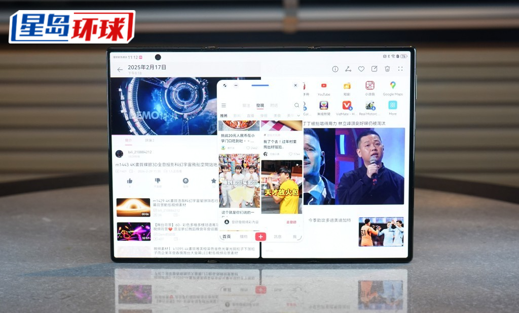 當以內摺方式打開成雙屏狀態,HUAWEI Mate XT|ULTIMATE DESIGN畫面隨即變成7.9吋(解像度2.232×2,048),大小如見慣見熟的大芒摺機,閱讀文件或上網效果最好,亦可利用左右分屏進行多工處理,由于這時機身厚度已攤分成7.45mm及4.75mm兩部分,實際手握時重量感有所釋放。