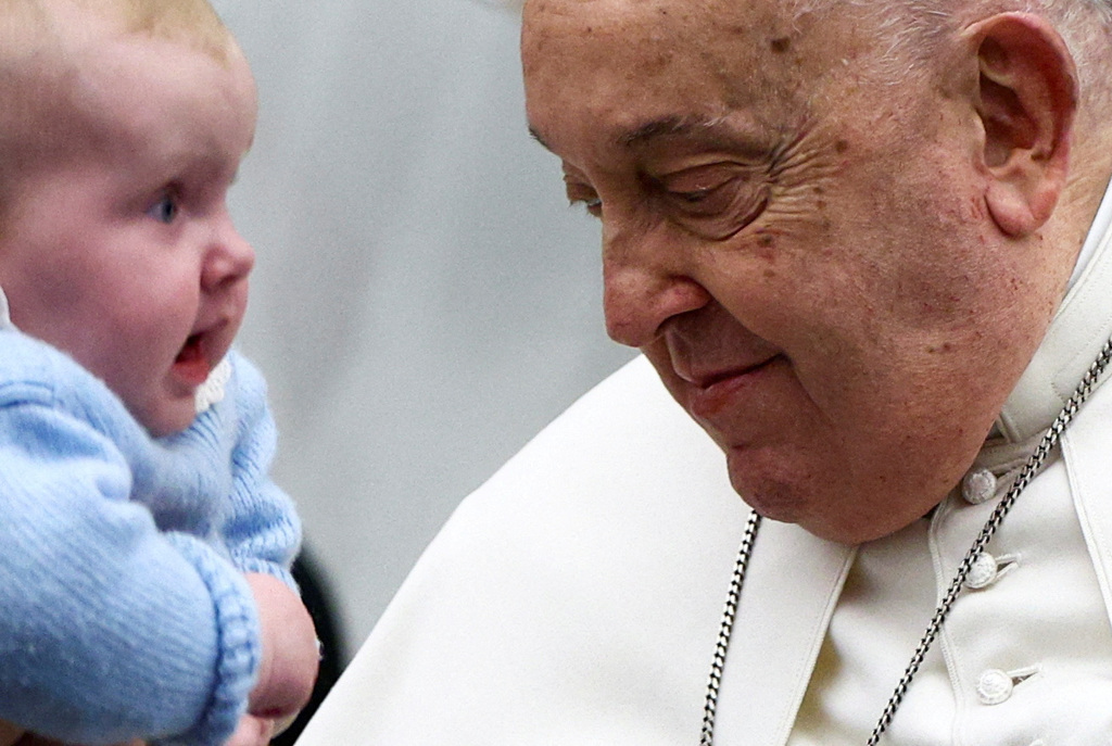 ▲天主教教宗方濟各12日在梵蒂岡例行公開接見教徒時與嬰兒互動。方濟各14日因呼吸困難住院。(資料照/路透)