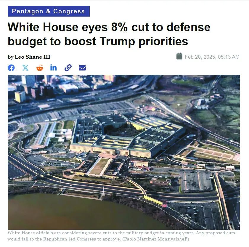 美國彭博社引述赫格塞思18日的一份備忘錄稱,他已指示“五角大樓高層”、作戰司令部、國防部機構、各軍種和文職機構在2月24日之前提交削減軍費的方案。