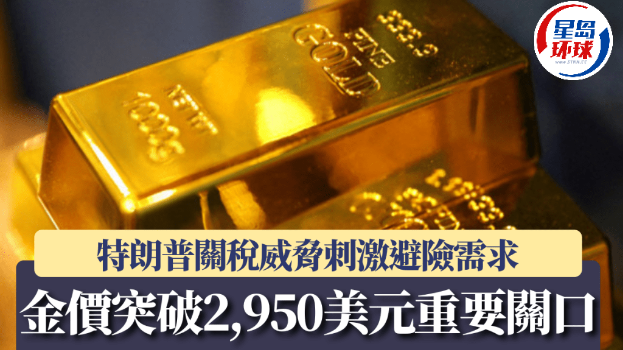 在美國總統特朗普加征關稅的威脅下,市場避險需求持續,令金價越升越有,再創歷史新高,最新報2,954美元。有分析人士指出,若金價持續突破2,950美元,將為黃金延續過去兩個月形成的上升趨勢奠定基礎。
