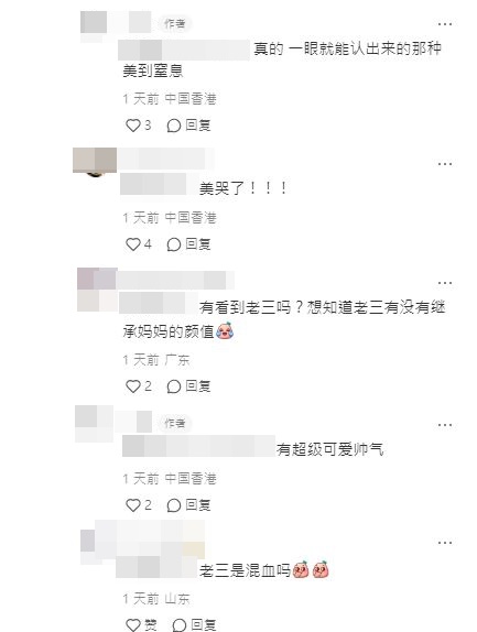 有網民就留言指當日在大型玩具店遇見栢芝,估計她正在買玩具給兒子:“一看她眉毛就認出來是她,超有辨識度。昨(前)天小孩玩玩具車剛好撞到她的鞋,上次在小區會所也看到她過來健身!整個人超美??! ”樓主也大表認同,直指張栢芝美到令人窒息,但其他網民似乎對其兒子更有興趣,留言問道:“有看到老三嗎?想知道老三有沒有繼承媽媽的顏值”,樓主即回覆:“有!超可愛帥氣”,但當有人問到“老三是混血嗎”、“像不像謝霆鋒啊”等問題,她就未有回覆。