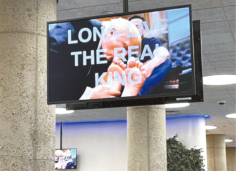 ▲住房和城市發展部的員工餐廳電視,播出一段偽造的特朗普吻馬斯克臭腳視頻,特朗普吻馬斯克臭腳,鏡頭前寫著“真正的國王萬歲”的字樣。 視頻截圖