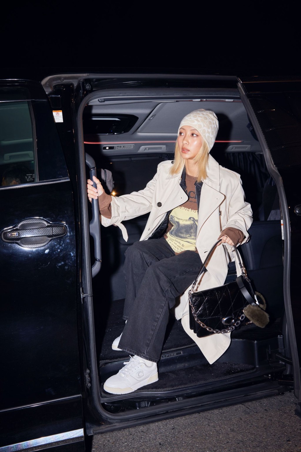 ▲女團Collar成員邱彥筒(Marf), 以風衣配搭牛仔褲,襯以COACH新推的循環再生皮革制Soho Sneakers/$1,850,休閑又時尚。