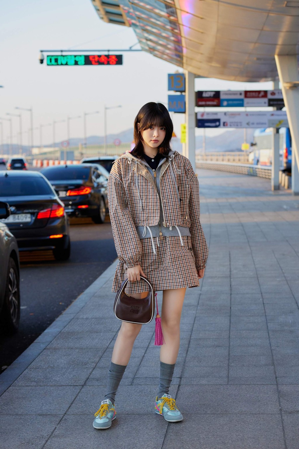 ▲韓國女團 LE SSERAFIM成員洪恩采( Hong Eunchae)穿著Miu Miu春夏系列套裝,配搭鮮艷拼色Sneakers ,搶眼又活潑。