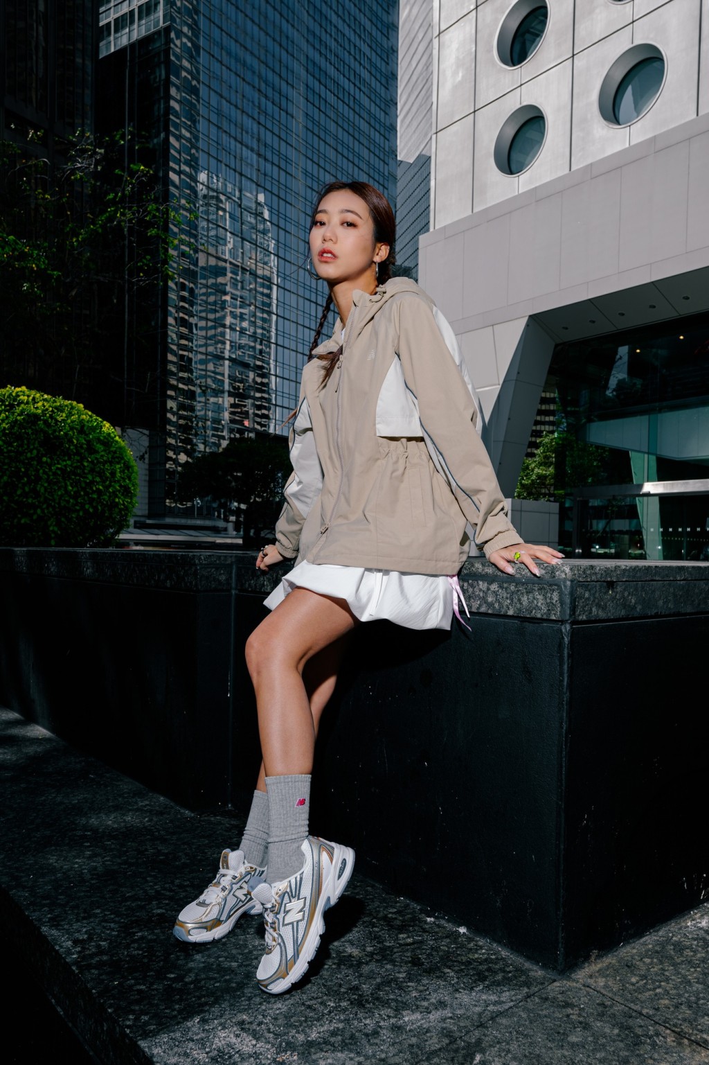 ▲本地女歌手陳凱詠(Jace)以短裙襯風褸造型,配搭全新配色的740波鞋/$849,發放Y2K復古型魅/$849/B。(圖片來源:Facebook@New Balance Hong Kong Lifestyle)