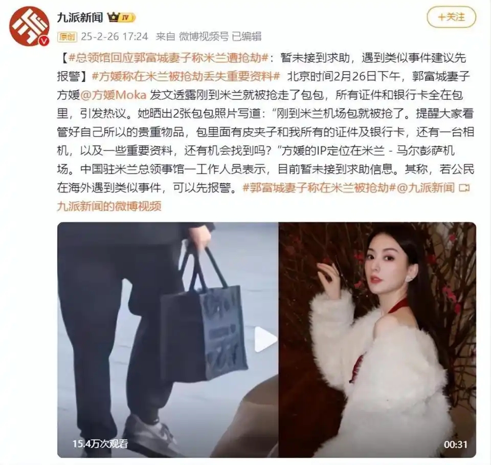 北京時間2月26日下午,郭富城妻子方媛發文透露剛到米蘭就被搶走了包包,所有證件和銀行卡全在包里,引發熱議。