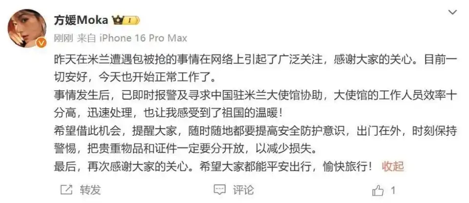 方媛還提醒網友隨時隨地都要提高安全防護意識,“出門在外,時刻保持警惕,把貴重物品和證件一定要分開放,以減少損失。最后,再次感謝大家的關心。希望大家都能平安出行,愉快旅行!”