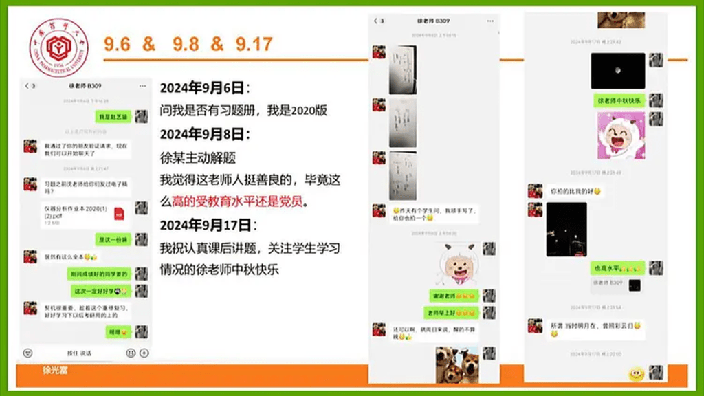 網傳消息爆料,南京中國藥科大學理學院化學系主任、副教授徐某某疑似性騷擾女學生,該學生將兩人大量聊天記錄曝光到網上,令無數網友看了后直呼受不了。舉報人制作PPT舉報,內容是該女生與徐某某的聊天記錄,顯示2024年9月至2025年1月17日該女生一直受騷擾。