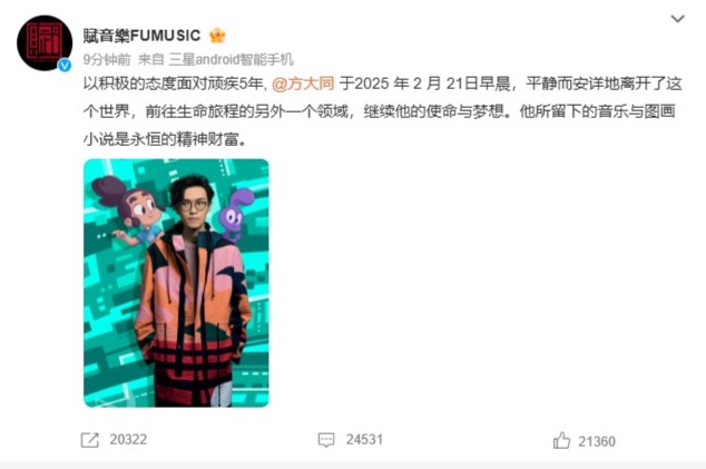 方大同于2005年出道,憑《愛愛愛》、《Love Song》等歌曲紅遍華語樂壇。及至2022年推出歌曲《清楚點》后一直神隱,曾傳出患病。方大同直至去年9月才復出樂壇更曾公開露面,當時已身形暴瘦,直認:“從抱恙的日子走上了康復之路”,直至本月3月1日由佢所屬公司宣布因病離世。賦音樂今日在微博及FB發文,稱方大同對抗頑疾5年,于2月21日因病離世。