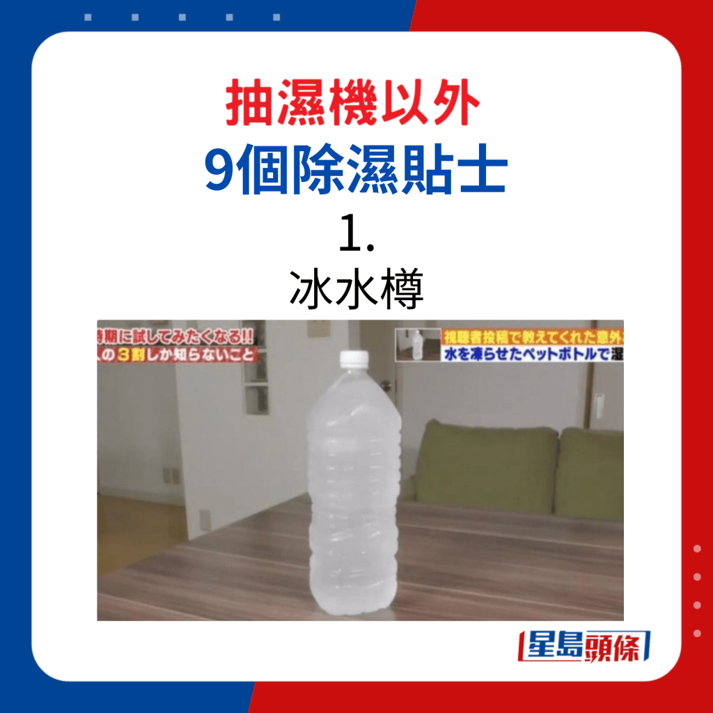 日本朝日電視臺綜藝節目《くりぃむしちゅーのハナタカ!優越館》就曾經介紹個一個超強方法去除濕,而且非常簡單容易,只需HK$0便可做到!這方法只需預備一支塑料瓶裝水,并將水放冰箱冷藏直至完全結冰,然后將“冰水”放在家中需要除濕的位置,例如是衣柜、廚房或浴室等,即可吸濕。