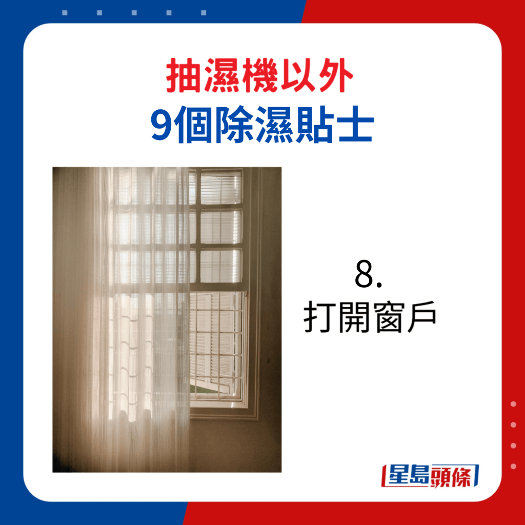 打開窗戶讓室外空氣流通,維持除濕效果,惟最好選擇有風或室外濕度較低的日子。