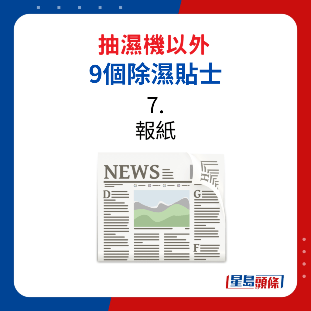 報紙上的油墨具吸水的作用,將之放在范圍細小的地方,例如梳妝臺的抽屜、地板、衣柜及鞋柜內,均可有助吸濕。